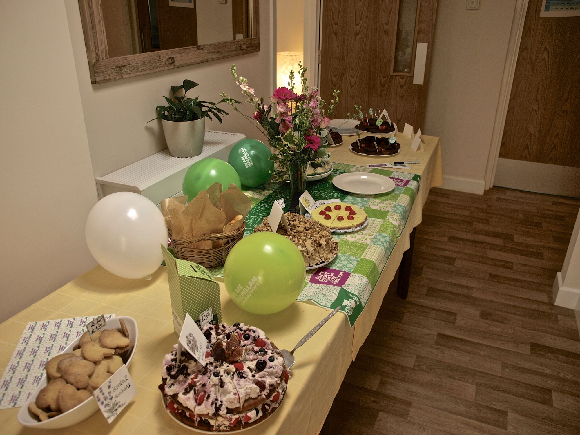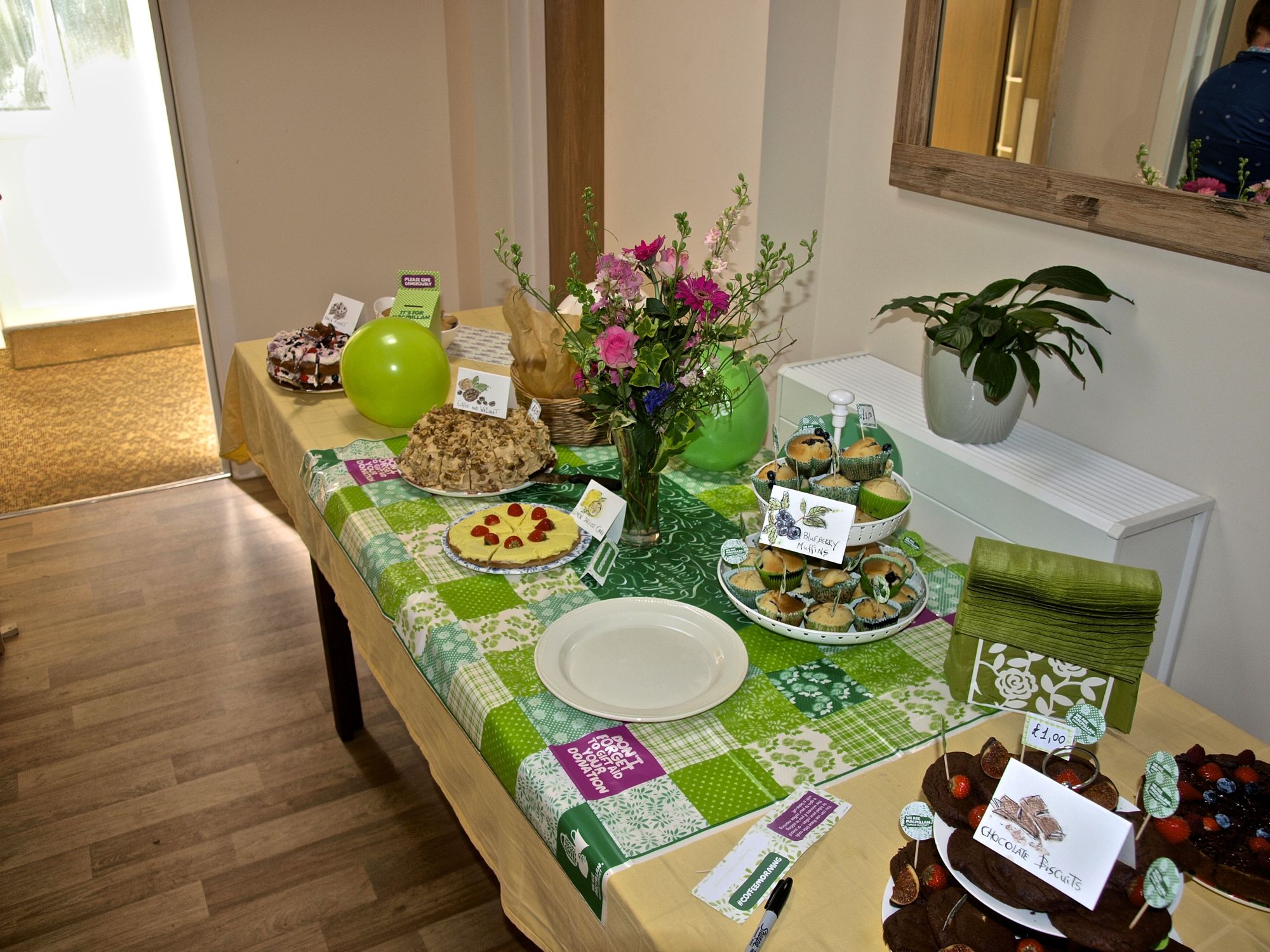Ein Companion in meinem Haus hatte vor einiger Zeit die Idee, sich gemeinnützig zu engagieren. Er hatte sich überlegt, einen Coffee Morning in unserem Haus zu veranstalten, bei dem wir Kuchen und Kaffee verkaufen und das Geld an eine Krebshilfe Organisation, “Macmillan Cancer Support“, zu spenden. Und so fand letzten Dienstag in unserem Haus von 10-12 Uhr der Coffee Morning statt.