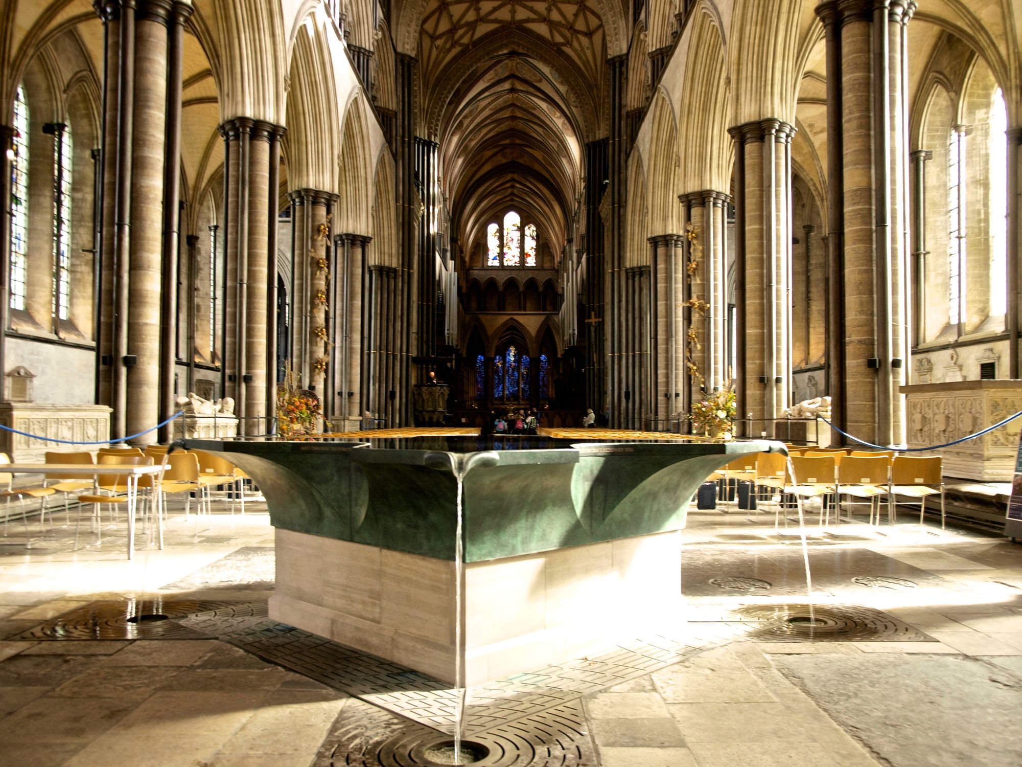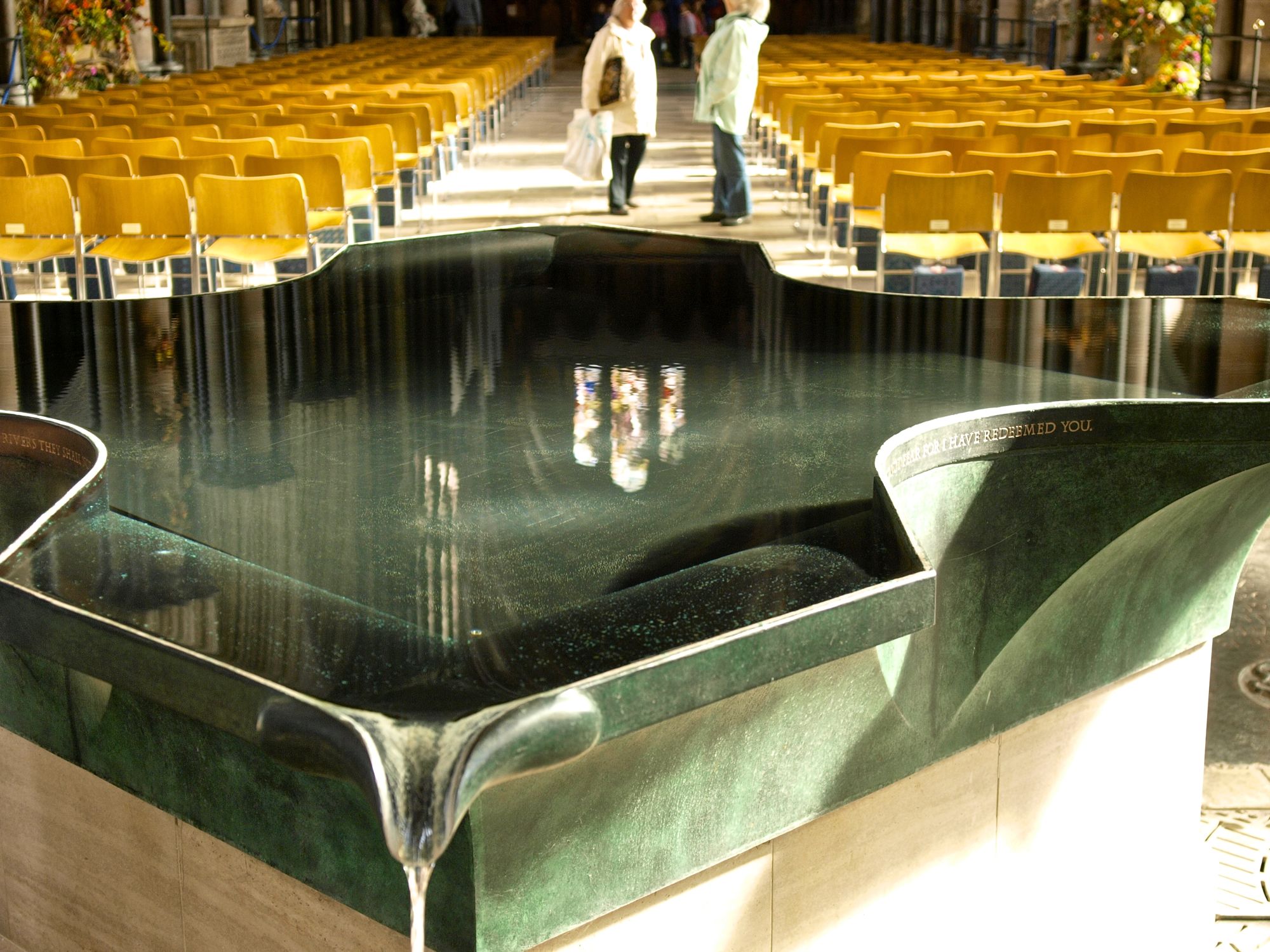 Mit das beeindruckendste ist das Taufbecken, das zu Beginn des Gangs steht. Was an der “water sculpture” so faszinierend und gleichzeitig verwirrend ist, ist, dass die Wasseroberfläche sich nicht bewegt, jedoch trotzdem ohne Unterbrechung das Wasser aus dem Becken strömt. Es ist schwer zu erklären, das Bild wird es am besten zeigen: