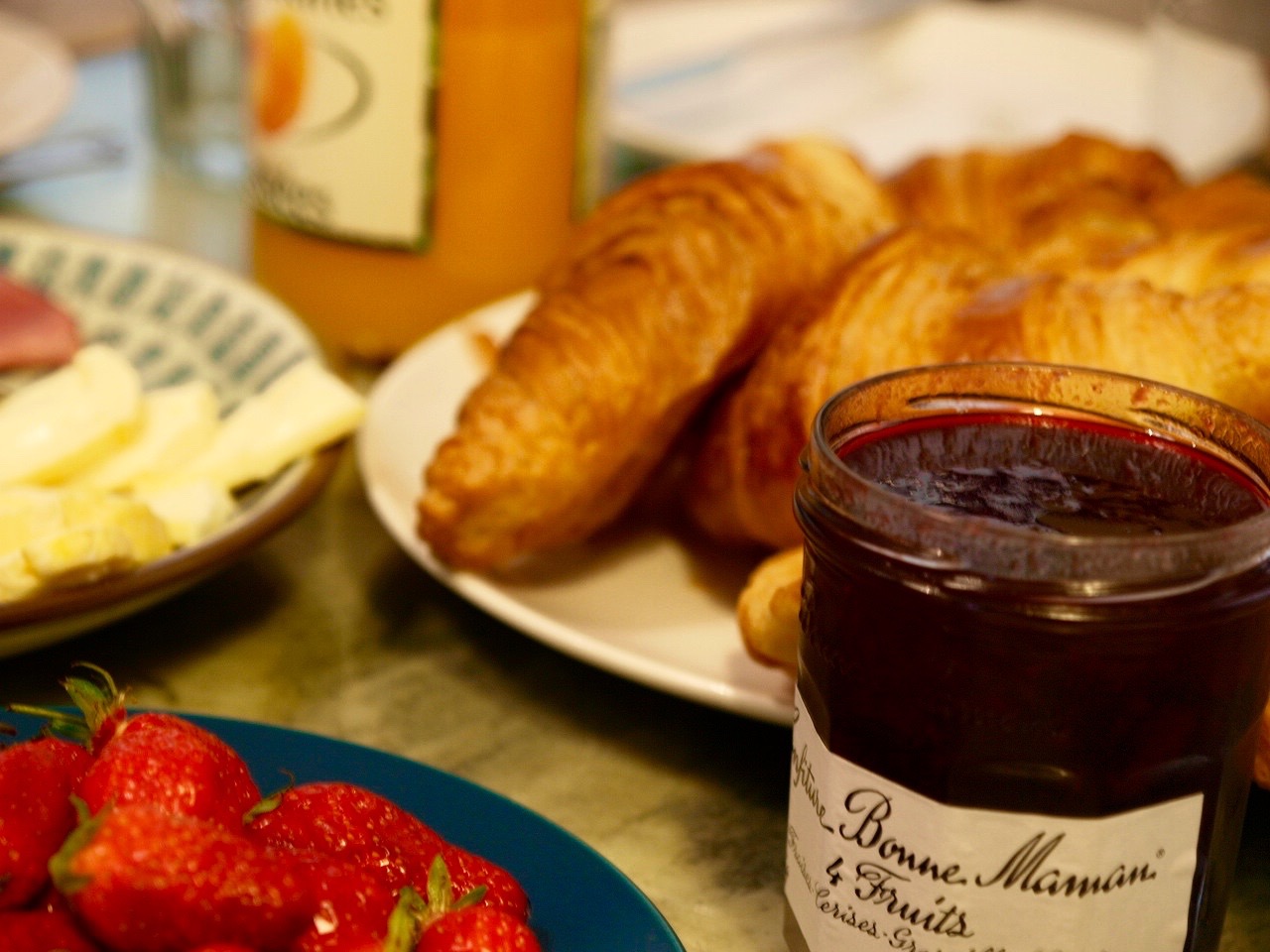 Was anderes wünscht man sich fürs erste Frühstück in Paris als frische Coissants, Erdbeeren, Marmelade und Käse?