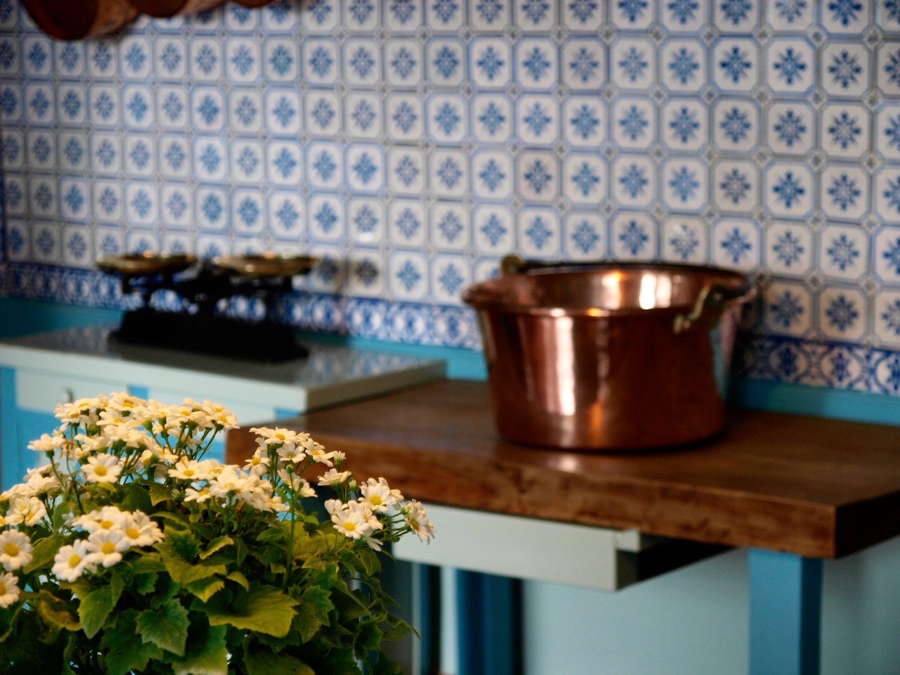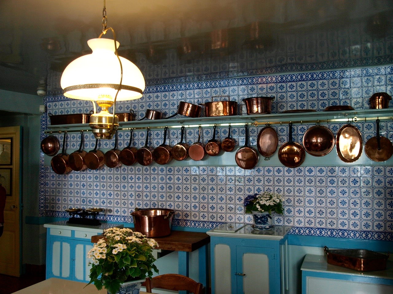 Ich habe noch nie so eine blaue Küche gesehen. Im Kontrast dazu, war das Esszimmer komplett in einem Sonnengelb.